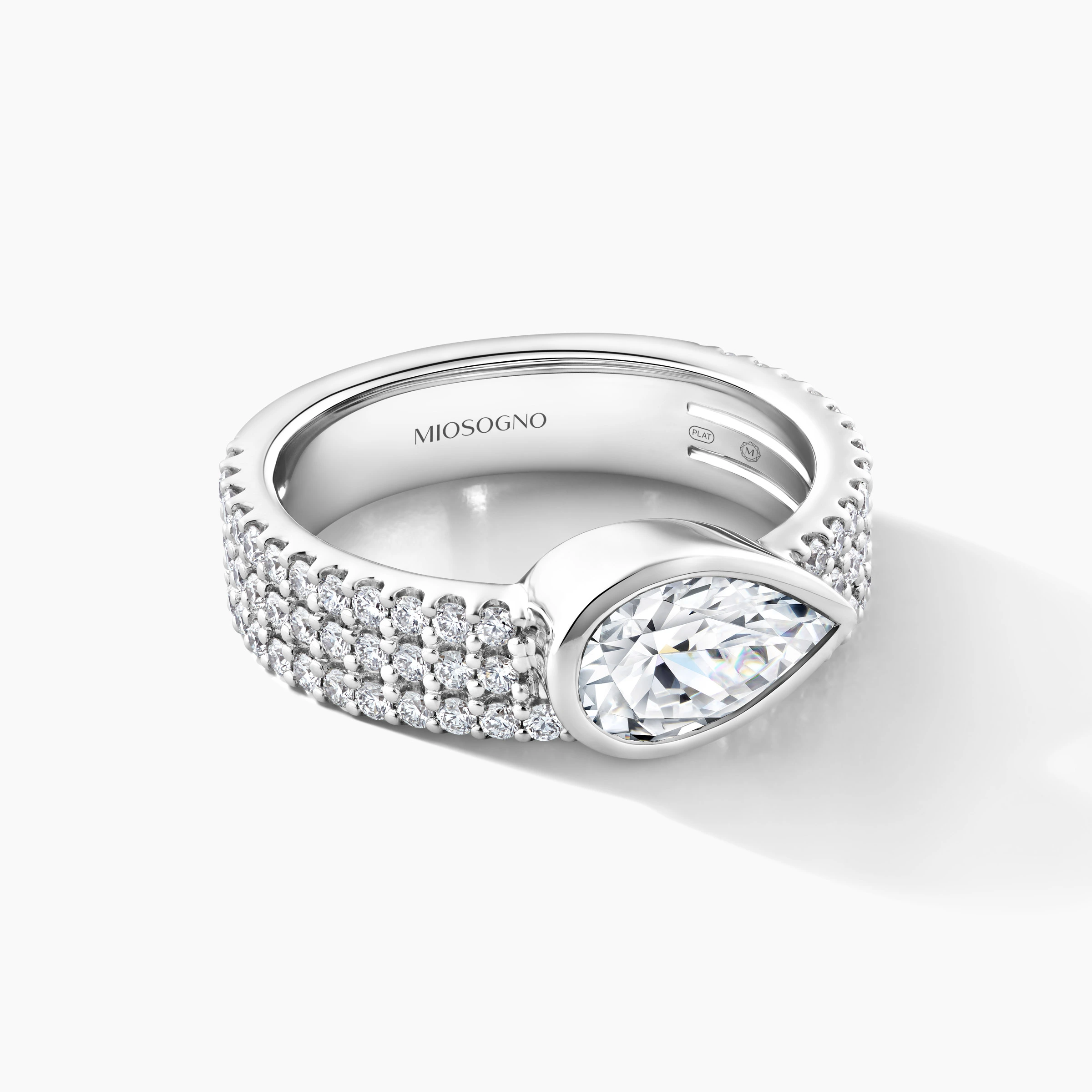 A gracefully curved pave ring of unparalleled elegance features a mesmerizing pear-shaped diamond, seemingly suspended in midair within a meticulously crafted high-polished bezel setting.