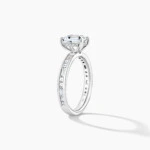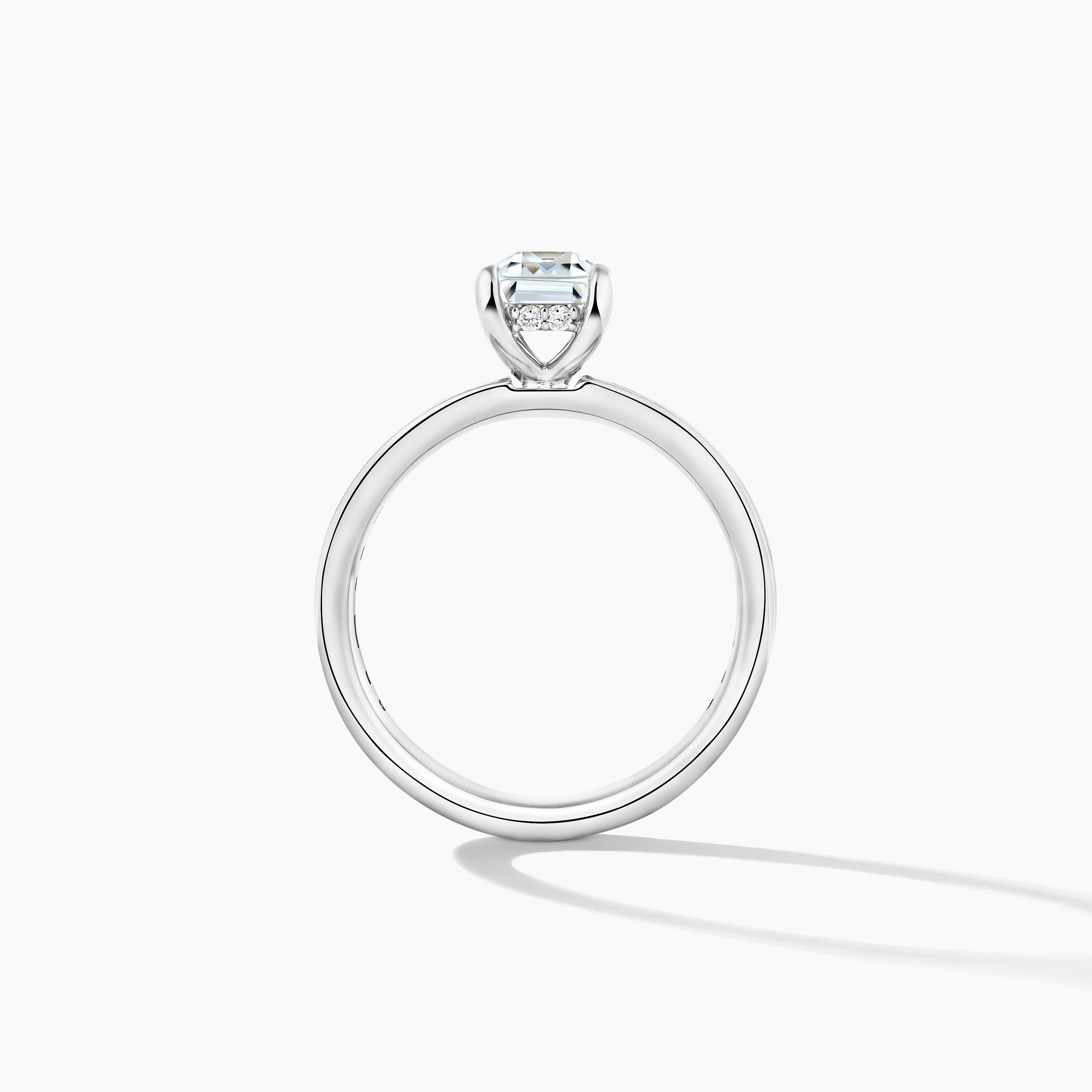 Anticipate the delight as you slide on this emerald-cut solitaire, enhanced by a hidden halo and channel-set baguette and carre’ cut diamonds along the glowing platinum band. A contemporary classic steeped in iconic luxury and craftsmanship.