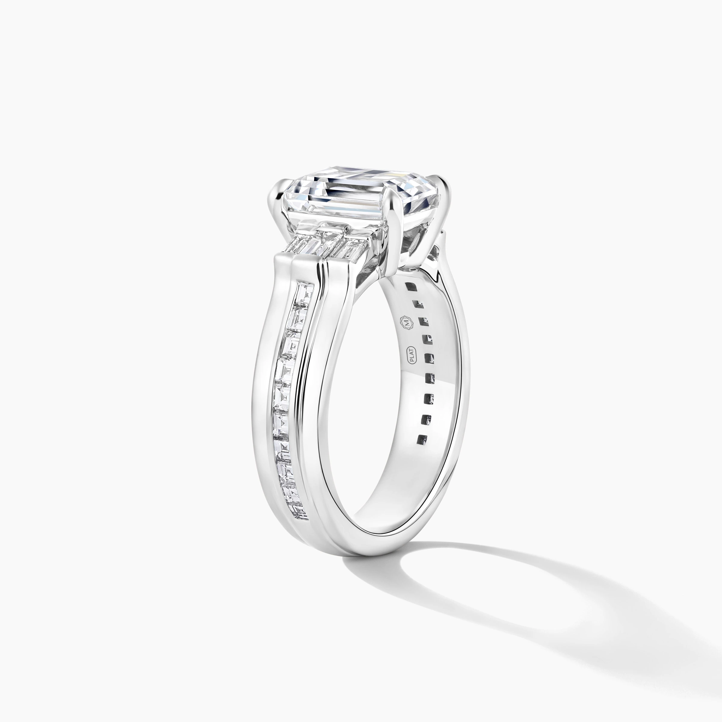 Embrace couture elegance with this contoured emerald-cut diamond, accompanied by three accent baguette diamonds on each side. Channel-set square diamonds against the platinum sheen captivate and hold everyone’s attention.